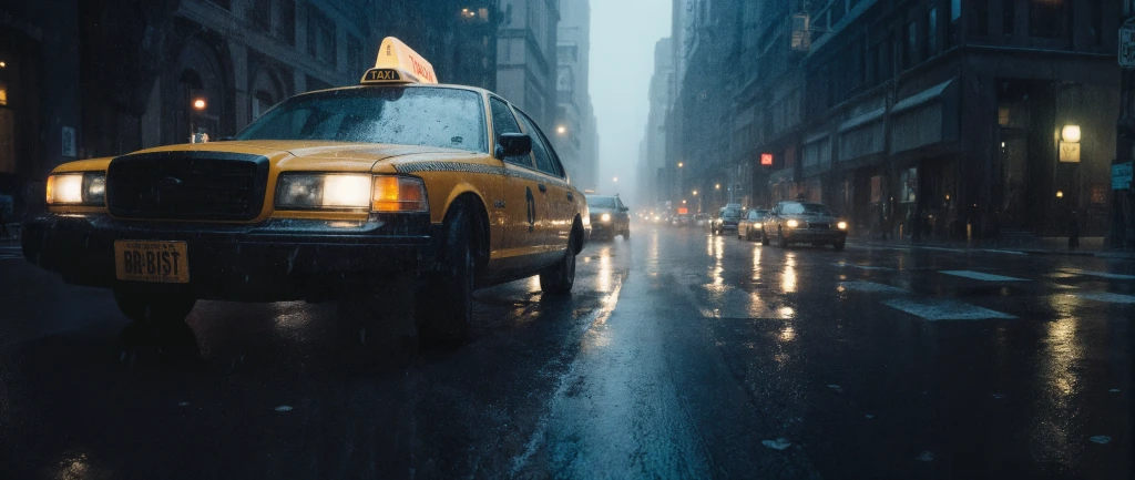 A taxi driver pulling up in 80s new york, vibe of Taxi driver movie still, intense action scene, taxi is close to zoomed out camera, moody cityscape, low light photography, deep blacks, soft highlights, cinematic rain, neon reflections, overcast dusk, crushed shadows, high contrast, Fujifilm-like toning, desaturated blues, misty ambiance, light bloom, subdued palette, minimal saturation, city at night aesthetic